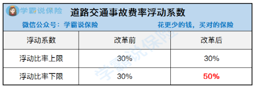 赔付额度提高了,但交强险的基础保费不变,这本就是妥妥的“加量不加价”。但为了鼓励安全驾驶的文明司机,车改后保费的下浮比率由之前的最高优惠30%下降到50%!