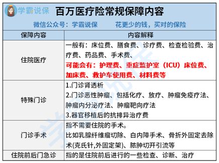 一款百万医疗险保障责任是否全面,要看可报销的费用项目是否涵盖齐全,该有的项目要有,因为这样的话也就意味着我们的报销范围更广,能报销的费用也就越多,百万医疗险常规的保障内容如下图所示:
