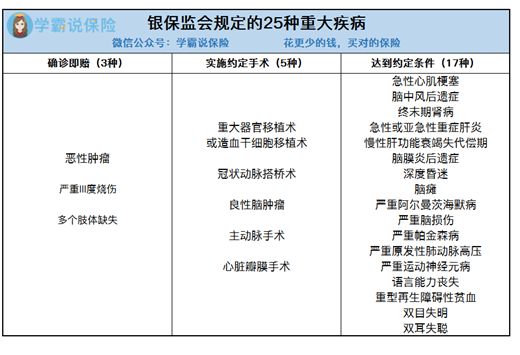 首先,银保监对25种高发重疾险进行了定义,一款合格的重疾险产品应当涵盖下图25种重疾,如果缺乏多种高发重疾,那就要谨慎购买了。