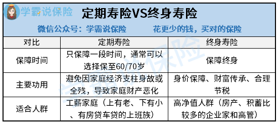 对于90%的普通投保人而言,只需要购买定期寿险就可以了,若是预算充足,考虑遗产规划,以储蓄加保障为目的性的投保人就可以选择终身寿险。