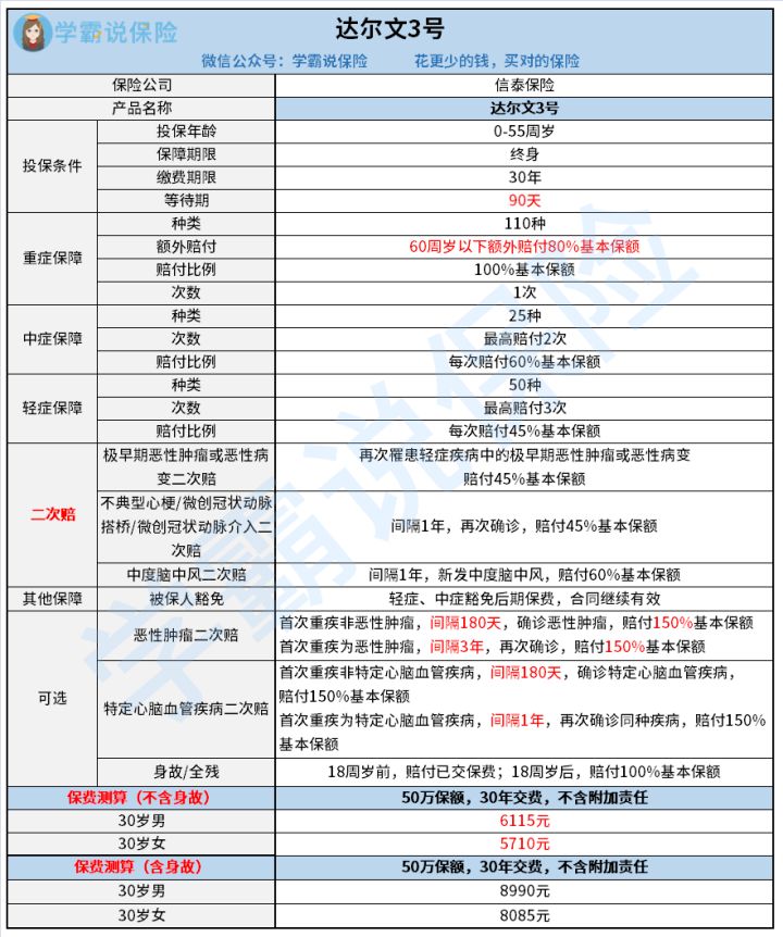 达尔文3号是信泰人寿推出的一款重大疾病保险,当然可信靠谱。前不久这款产品保至70周岁版本停售了,目前只有保终身这一版本可以购买,不过这也完全不影响这款产品受欢迎的程度。学姐也一直有收到询问这款产品的私信,那这款产品的保障内容真有这么好吗?我们马上来看看。 想知道这款产品在重疾险中属于什么水平,还可以看看这份对比表哦。 下面废话不多说,先看看这款产品的内容简介,再直接分析这款产品的各项内容: 1、等待期较短。 目前市面上的重疾险产品等待期基本分为90天或180天这两个档次。对比起等待期为180天的重疾险产品,可以说达尔文3号是款很良心的重疾险产品啦。 2、等待期条款宽松。 市面上有不少重疾险产品虽然等待期为90天,但其具体的条款规定可以说是非常严苛,一旦在等待期内出险,不管罹患的是轻症还是中症、重疾,整份保险合同都直接终止。像支付宝上挺火的好医保健康福就是这样。 而达尔文3号在等待期内,若被保险人是因为意外伤害以外的原因导致初次患保险合同所定义的中症疾病、轻症疾病,保险公司只是不承担给付保险金的责任,且该一种或多种疾病的保险责任终止,保险合同继续有效。 也就是说只是不再对等待期内罹患的这一种或几种疾病承担保险责任,但是对保险合同上约定的其他轻症、中症疾病以及重疾都还是承保的,万一不幸发生得了其中的一种或多种疾病,保险公司依然会根据保险合同给付保险金。 投保重疾险过程中,不可避免的环节就是健康告知。而且重疾险可以说是各类保险中对健康告知要求最高的险种了。在没有只能核保之前,人工核保通常是“一刀切”的模式,对某种疾病不会多加分辨,只要患有该种疾病就直接拒保。所幸的是随着电脑技术的发展,现在除了传统的人工核保,还有了“智能核保”。 智能核保是相对于人工核保而言的,智能核保对疾病的判别会更加精准,同时投保要求也就更加宽松,对一些有小病痛的人来说更加容易获得承保。不过技术虽好也不是每款重疾险都有的。幸运的是达尔文3号就有智能核保。 比如甲状腺结节,有不少重疾险是直接拒保有甲状腺结节的人的,但是达尔文3号智能核保对此有进行一个细分,如对在半年内有做过甲状腺超声检查,且明确分为1级和2级的消费者是正常承保的。 如果想了解更多有关健康告知的内容,或者担心健康告知不过关的,可以看看这篇: 1、保障内容全面。 且不说这款产品承保了110种重疾,25种中症和50种轻症,基本涵盖了所有的高发重疾风险及其前期病症。这款产品最大的亮点是对几种高发轻中症还有二次赔! 对于“早期癌症”、“中度脑中风”和“不典型心梗”这三种高发轻中症以及进行“微创冠状动脉搭桥”和“微创冠状动脉介入”手术,均可以获得二次赔付。 此外,还可以选择附加“恶性肿瘤二次赔”“特定心脑血管疾病二次赔”。 很多人都不太清楚重疾险保的疾病到底有哪些,怎么样才可以获得赔偿,关于这些问题,如果你也感到困惑,可以看看下面的文章哦。 2、赔付比例高。 考虑到在60周岁前被保险人要承担的家庭经济责任可能比较重。所以达尔文3号还规定,如果是在60岁前若不幸罹患保险合同约定的重疾,那么还可以额外获得80%基本保额的赔付。 这一额外赔付的力度可以说很大了。大部分的重疾险产品即使有额外赔付,额外赔付的比例也都大多在20%~40%,很少有50%以上的,更别说达到80%了。 3、可以选择附加身故保障。 很多人都会有一个忧虑,就是买了重疾险,一生平安没有得重疾或者中症、轻症,那岂不是白交了?虽然买保险并不是希望能出险,买的就是这无形的保障,但是有这个担忧也是人之常情。 如果你也有这个忧虑,那可以选像达尔文3号一样,带有身故责任的重疾险,达尔文3号含有身故的价格在市场上还是非常有竞争力的,男性投保50万,分30年交,保终身且含身故保障也只需要8990元。 综上可见,达尔文3号保障内容全面可靠,产品整体的性价比较高,是一款值得考虑的重疾险产品。当然,这款产品也并非说毫无缺点,大家也可以看看下面这篇文章,看后辩证地思考是否要购买。