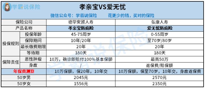市面上卖的火热的防癌险有很多,学姐就拿当前保障最好的这款爱无忧防癌险来跟孝亲宝做一个对比: