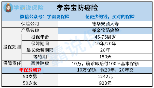 从图中可以看出,孝亲宝是一款老年定期防癌险,最长可保障20年,保障内容也比较简单,仅仅保障恶性肿瘤一种疾病,没什么好分析的,学姐就其它方面说说这款产品的优缺点吧: