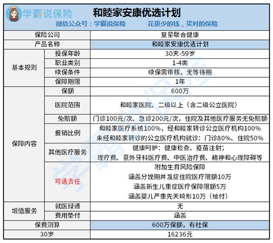 二、和睦家安康优选计划怎么样?复星联合的和睦安康优选计划是此前的永安暗盒医疗保险计划的迭代产品,适合长期习惯在和睦家医疗系统看病或希望享受高端医疗服务的人群投保。