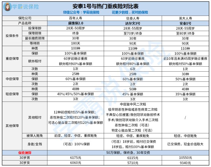 作为单次赔付的重疾险,安泰除了基本保障没有任何附加保障,而其他两款产品都有不同的侧重点的二次赔保障,相比之下,安泰的保障完全不够用。