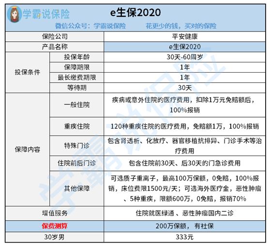 举个例子:老王患病住院治疗,总花费为10万元,社保报销了4万,e生保在扣除1万元的免赔额后,报销了5万。