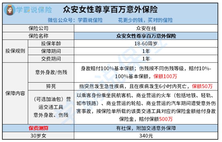 2、保费偏贵:这款说是主打女性,但是在细节方面我也没看到多偏向女性,而且在保费上,附加了实用的加油包之后,一年要340元,一般的意外险都是100-200元。例如众安自己家的个人综合意外,一年也不过140元,这保费可是差了一只口红呀,不得不说这众安女性百万的保费确实是有点高了。