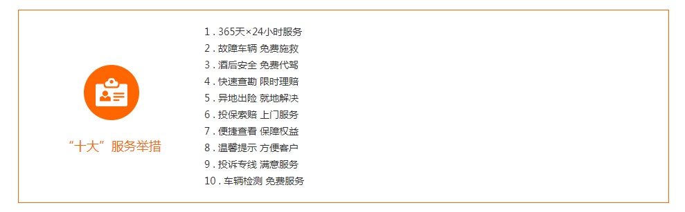 中华联合车险有十大服务举措,包括365天×24小时服务、故障车辆免费施救、免费代驾、快速查勘 、异地出险就地解决等等: