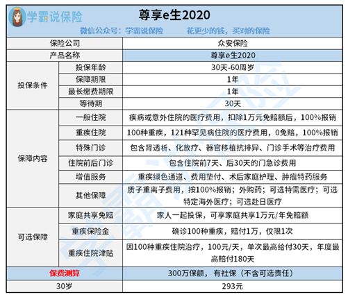 如果你不太看重续保条件的话,那尊享e生这款产品还是非常不错的,保障内容全面、保额高,而且价格也不贵。下面我们就来看一下这款产品的具体内容。