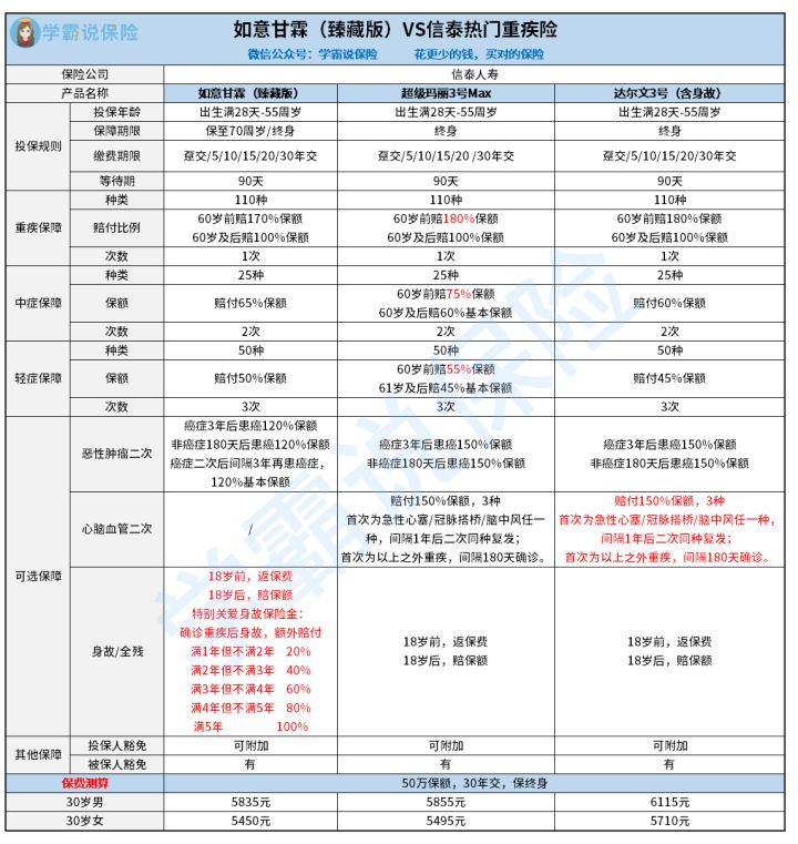 2.信泰如意甘霖臻藏版PK信泰其他热门重疾险,谁更胜一筹?