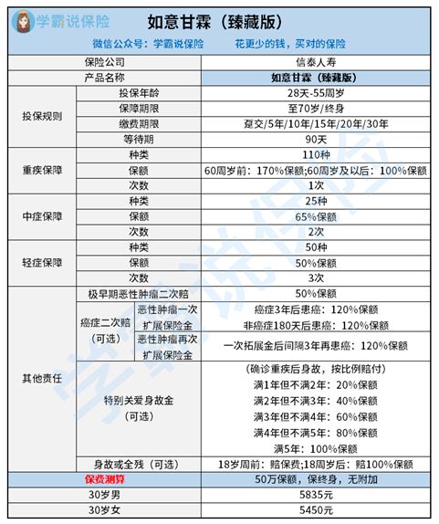 信泰如意甘霖臻藏版是一款单次赔付重疾险,可保至70岁/终身。