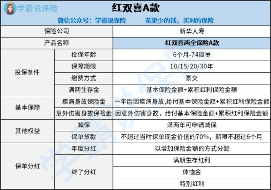 红双喜是新华人寿推出的两全保险。两全保险也称为生死保险,也就是身故了进行理赔,生存着就返还生存金,听起来还是不错滴。