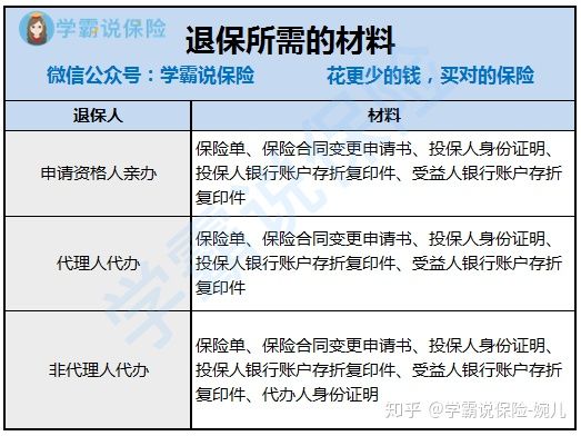 退保需要的材料无法就是保险单、保险合同变更申请书、身份证、银行卡,以下分了三种不同退保人需要准备的资料,分别是申请资格人亲办、代理人代办、非代理人代办,但需要的资料也是大同小异,详细的内容请看下图: