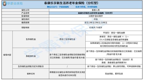 从学姐做的产品图可知,乐享新生活养老年金保险(分红型)的保障简单,只包含养老年金、身故保险金和保单红利。