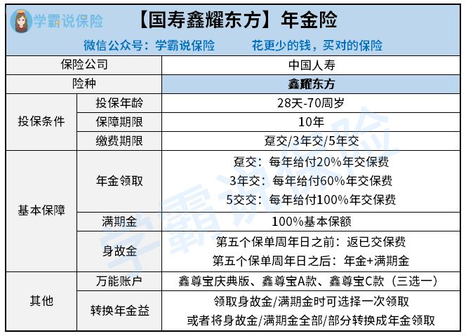 值得注意的是,这款产品每年领取的年金和缴费期限有关:趸交每年领取20%年金保费;3年交每年领取60%年金保费;5年交每年领取100%年金保费。
