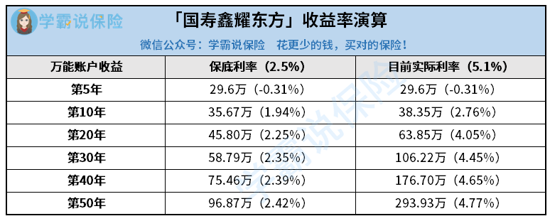 如果只看鑫耀东方的万能账户结算利率,高达 5.1% 确实很不错,不过只看万能账户的收益还是很片面的, “任何不谈IRR的年金险都是耍流氓”