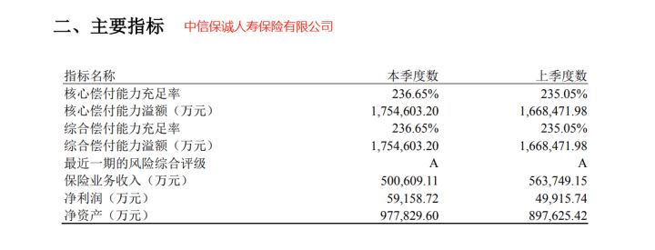 中信保诚人寿2020年第3季度的偿还能力报告如下: