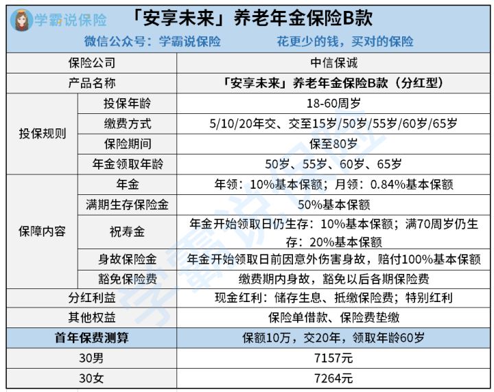 下面学姐就挑居中B款给大家测评,也就是安享未来养老年金保险B款(分红型)产品测评的重点: