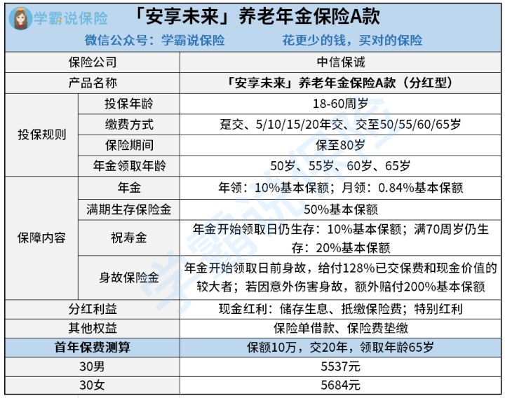 回归今天的主题,这款叫中信保诚安享未来养老年金保险A款(分红型)的产品,别看名字有点长,估计产品的保障内容不一般吧!