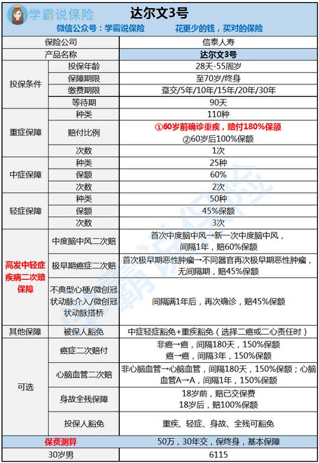作为信泰人寿单次赔付重疾险的巅峰,达尔文3号从上线以来就颇受大家关注,看过它的保障内容的没有说不好的,那么这款产品究竟有多大的魅力,赢得了众人的一致认可呢?我们今天就来扒扒达尔文3号背后的故事~ 本文重点 那些年达尔文3号家喻户晓的优秀保障——闪光点和不足大剖析 废话少说,直接上图: 达尔文3号的保障内容通过这张图就能看出来,学姐就直接来说说达尔文3号的闪光点了。 闪光点一、重疾额外赔付比例高 达尔文3号是信泰推出的一款单次赔付重疾险,这款产品重疾保障除了有其他产品都有的保额保障之外,还加入了额外赔付:60岁之前确诊重疾,还可额外获得80%基本保额赔付,这是目前最好的额外赔付比例了,十分优秀! 但细心的朋友应该也知道,信泰除了达尔文3号这款产品外,同期还有一款与达尔文3号十分相似的重疾险在重疾额外赔付方面也是有这么高的赔付比例的,这款产品就是超级玛丽3号MAx,这款产品的优缺点学姐已经整理出来了,大家可看这篇: 闪光点二、最高发轻中症均可2次赔 中度脑中风、早期恶性肿瘤、不典型心梗/微创冠状动脉介入/微创冠状动脉搭桥这3大高发轻中症都是可以2次赔付的,拥有这个优势,可以完胜市面上90%的重疾险产品了。 闪光点三、癌症多次赔 癌症2次赔付,指的是如果得了癌症,并且能够活过一定的期限,依然还是带癌状态,可以拿到第2笔理赔。 达尔文3号作为单次赔付重疾险,包含了癌症2次赔可选责任,且赔付金额是150%保额,可以说是非常不错的,且我们都知道,癌症是一种转移、复发等几率都是非常高的重疾,包含多次赔付是十分重要的。 作为单次赔付重疾险,达尔文3号拥有这么多闪光点,信泰重疾险“巅峰”也不是虚的,投保这一产品绝对没错。 但有些朋友可能会对信泰人寿这家公司实力有疑惑,担心这家公司的实力的朋友不妨来看看这条: 说完这些不足,我们就来看看达尔文3号这款产品还有哪些不足? 不足一、可承保职业范围窄 达尔文3号这款产品可承保的职业范围只有1-4类,5类及以上职业范围的人群例如有刑警、高空作业等人群是不能投保的。 不足二、中度脑中风理赔条件略微严苛 对比普通的产品,达尔文3号少了一个可选项,且必须达到肌力要求才能赔付,少一个选择,赔付就少了些机会。 一般的产品: 达尔文3号定义: 总结,达尔文3号作为单次赔付重疾险,它的优缺点也是非常明显的,且可附加这么多选项价格还不贵,性价比十足的好产品,追求高性价比、癌症多次赔、心脑血管多次赔的朋友来说,选择这款产品在合适不过了。 但是如果觉得这款产品还有不能满足自己需求的地方,大家还可选择这些产品: