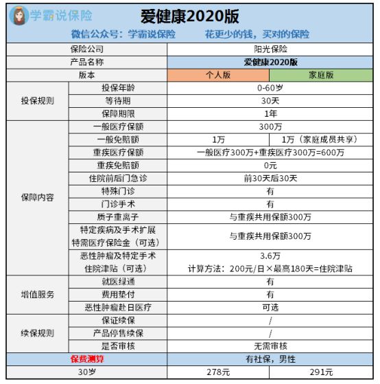 听说有好的百万医疗险产品推出,学姐骂骂咧咧,噢不,是急急忙忙赶来给大家伙测评。阳光保险的爱健康2020版百万医疗险宣称可家庭投保,可选恶性肿瘤赴日医疗等等多选责任,保障内容丰富多样。到底是不是真的,学姐火眼金睛一看便知。
