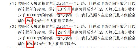 如图可见,在保险合同生效的2个保单年度内,累计18个月且每月至少有25天的步数超过10000步,额外给付5%;累计24个月且每月至少有25天的步数超过10000步,额外给付10%。