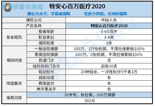 特安心百万医疗2020的一般住院保额为300万,有1万元的免赔额,不限社保,100%报销。