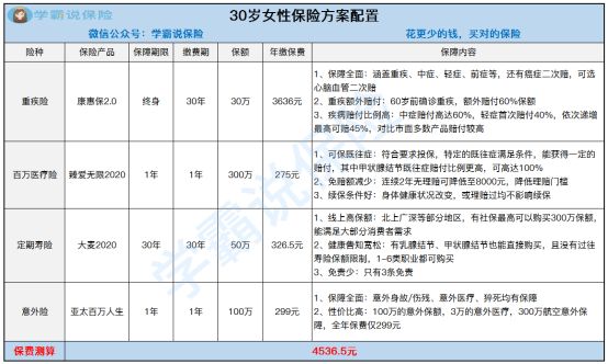 综合第一部分所讲,学姐配置了一套保险方案,给30岁女性朋友参考: