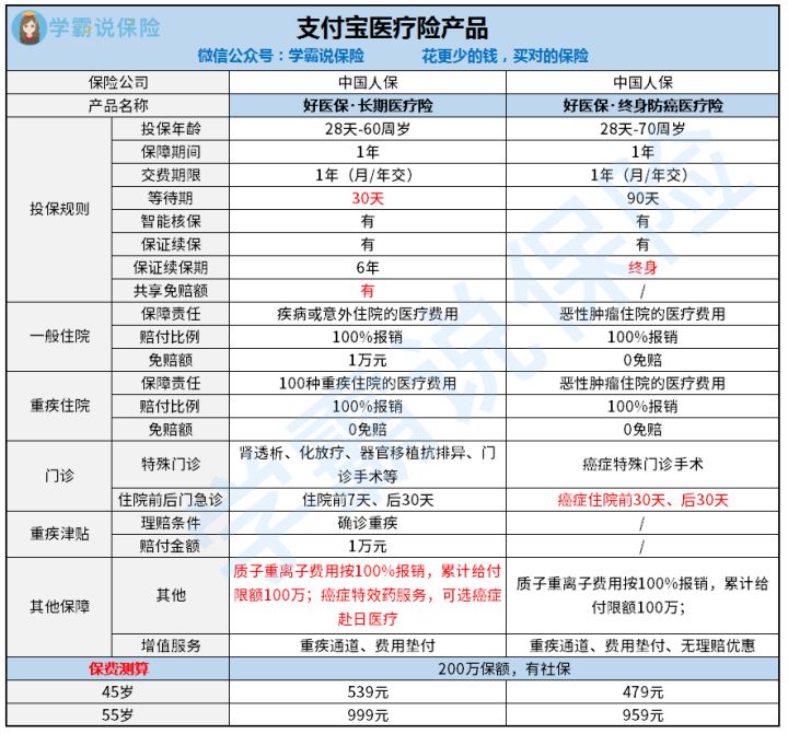 上周末,小姨不知道从哪听说了支付宝的保险很便宜,一个月只需要几块钱,就可以买到上百万的保险,想给年过50的父母买来试试,但是又怕这么便宜有坑,犹豫着不敢入手。 支付宝的保险到底怎么样,给父母买保险靠不靠谱,是“真的划算”还是“便宜没好货”呢,我们来一探究竟。开始之前,先来看看给老年人买保险要注意什么问题 本文重点: ·老年人适合买什么保险? ·支付宝的保险适合老年人购买吗? 一、老年人适合买什么保险? 由于老年人年纪大,身体小毛病也挺多,可以选择的保险并不多,建议给老年人配齐以下险种: 1.防癌险 防癌险,顾名思义,就是只保障癌症的保险。投保门槛低,即使是80岁高龄也可以投保,健康告知宽松,即使有糖尿病、高血压、高血脂、高血糖等常见老人病人群都可以正常投保。 因罹患癌症住院时,可以一次性给付保额。癌症是老年人常见的高发疾病之一,治疗费用高、周期长,在老年人因身体和年龄原因无法投保重疾险时,防癌险也是个不错的选择。 关于防癌险还有疑问的朋友,可以看看这篇文章 2.医疗险 如果老年人身体健康,建议首选百万医疗险。百万医疗险的保障范围广,基本上可以报销大部分疾病的治疗费用,报销额度高达上百万,而且还有质子重离子、绿色就医通道、医疗费用垫付等增值服务,实用性比较强。 如果老年人身体欠佳,建议考虑防癌医疗险。防癌医疗险是只能报销癌症住院及诊疗所产生的医疗费用,报销范围十分有限,但是投保门槛低,即使三高人群也可以投保,保障了老年人高发且费用高的癌症,对于身体有些小毛病的老年人来说还是十分不错的。 比如市面上这些百万医疗险就十分不错,感兴趣的朋友可以看看这篇文章 3.意外险 老年人关节老化,行动不灵敏,遇到意外经常躲避不及,意外发生的风险很高。比如骨折、扭伤、擦伤、烫伤等,伤筋动骨一百天,老年人骨折可不是小事,治疗期十分长,需要格外注意。 意外险可以补偿非人为的意外伤害造成的损失,小到擦伤扭伤等日常伤害,大到交通事故等意外都可以获得赔付,对于老年人来说还是比较实用的。重要的是,意外险十分便宜,一年几百块钱就可以买到上百万的保额,杠杆非常高。 市面上适合老年人购买的意外险都整理好啦,感兴趣的朋友可以看看这篇文章 总的来说,老年人的保险配齐以上三类险种基本上保障就十分完善啦,那么支付宝里的保险怎么样呢?给父母买靠不靠谱呢?别急,且听学姐细细说。 二、支付宝的保险适合老年人购买吗? 支付宝上的蚂蚁保险不是保险公司,只是一个联系客户和保险公司的第三方平台,和其他保险销售平台一样,是合法合规的,同样受到保监会监管的,所以大家大可放心。 支付宝的保险产品有那么多,到底哪些适合老年人呢?学姐以支付宝上热销的好医保系列医疗险为例分析,话不多说,直接看图: 1.好医保长期医疗险 好医保长期医疗险是支付宝的“王牌”医疗险产品,除了背景过硬之外,保障内容也是可圈可点的,我们一起来数一数它的亮点: 亮点1:保证6年续保 对于一年期的医疗险产品来说,续保就是很大的一个问题,好医保长期医疗险保证6年续保,不会因为发生理赔或身体状况变化而影响续保,属实优秀。 亮点2:6年共享免赔额 好医保长期医疗险重疾住院0免赔额,一般住院有1万元免赔额,在续保的6年期间内,可以共享1万元免赔额,也就是说6年里生病住院的治疗费用累计金额超过1万元,剩下的就可以100%报销,可以说十分良心了。 免赔额也就是自费的部分,那么是不是越少越好呢,感兴趣的朋友可以看看这篇文章 亮点3:重疾津贴1万 好医保长期医疗险自带1万元的重疾津贴,一旦确诊重疾,立即给付1万元。这笔钱可以用于治疗期间的营养品补充和日常生活开销,有效缓解患者家庭经济压力,还是十分实用的。 亮点4:增值服务给力 好医保长期医疗险的增值服务十分给力,包括质子重离子、医疗费用垫付和绿色就医通道等,都是十分实用的保障。 比如医疗费用垫付服务,可以在重疾住院时向保险公司申请垫付,不用患者一下子掏出一大笔钱来交付押金,后续的医疗费用也由医院和保险公司对接,十分便利。 好医保的价格比较便宜,如果按月给付,每月只需要几十块钱就可以了,当然这么便宜的背后也是有原因的,感兴趣的朋友可以看看这篇文章 2.好医保防癌医疗险 好医保防癌医疗险虽说只保障癌症一大类疾病,但是保障内容也是十分不错的,主要有以下亮点: 亮点1:投保门槛低 好医保防癌医疗险的最高投保年龄为70岁,而且即使有三高、甲状腺结节、心脑血管疾病患者均可以正常投保,对于高龄且有三高等病症的老年人比较友好。 亮点2:癌症门急诊前后30天 好医保防癌医疗险可以报销住院前后30天的癌症门急诊治疗费用,包揽了住院前的门诊治疗、检查和出院后复诊、药物等费用报销,这前前后后累计也不是一笔小数目,好医保防癌医疗险都可以保险,确实值得点赞。 亮点3:终身保证续保 好医保防癌医疗险可以保证终身续保,续保免等待期、免健康告知,无理赔续保的话每年还可以增加20万保额,最高可加至500万。年纪越大,疾病发生的概率逐年增值,正是最需要保障的时候,好医保防癌医疗险可以终身续保,给了消费者一颗“定心丸”,免除后顾之忧,还是十分良心的。 但是,好医保防癌医疗险也是有缺点的,感兴趣的朋友可以看看这篇文章 总的