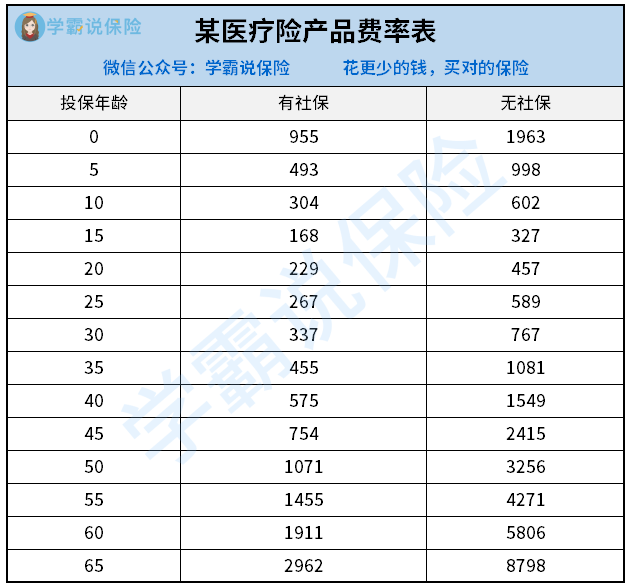 医疗险的保障期限都是一年,所以每年的费率都是不太一样的,根据年龄来调整费率,下图是某医疗险产品的费率表,大家可以参考参考:
