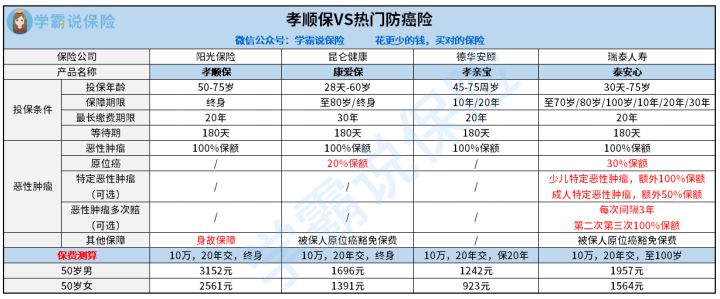 三、孝顺保和热门防癌险对比