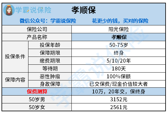 孝顺保是阳光保险公司推出的一款终身防癌险,专为老年人设计,话不多说,直接看图: