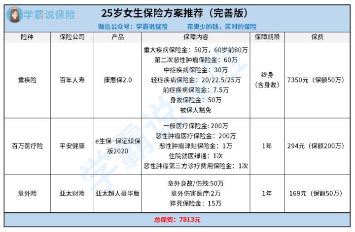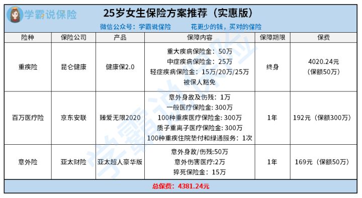 整套方案下来,只需要4000元左右,对于25岁女生来说压力不大,保障也比较全面,接下来学姐给大家分析一下: