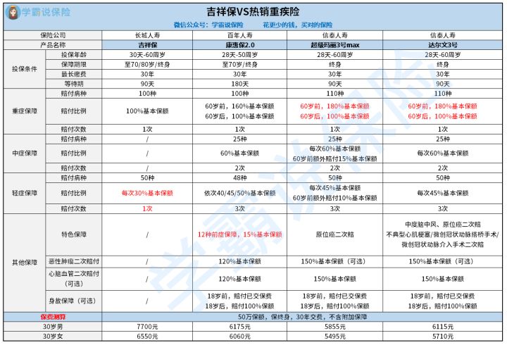 还是不死心的朋友看过来,为了了解长城吉祥保在市场上处于什么水平,学姐从选取了3款比较热卖的重疾险产品和吉祥保进行对比,话不多说,直接上图: