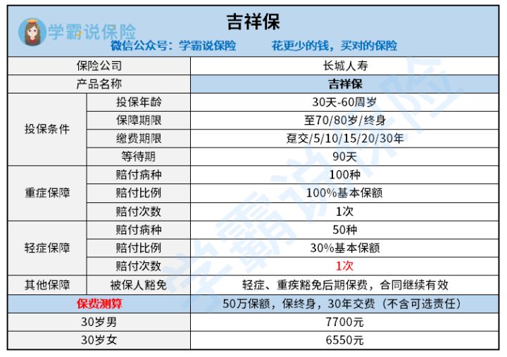 吉祥保的保障内容不出色,但是保费却一点都不低,30岁男性投保,50万保额保终身,30年缴费,每年需要7700元,缴费压力还是比较大的。这个价格完全可以买到更全面更高赔付比例的重疾险产品了,建议大家慎重考虑,不要在“一棵树上吊死”。